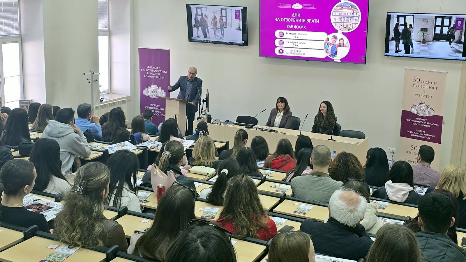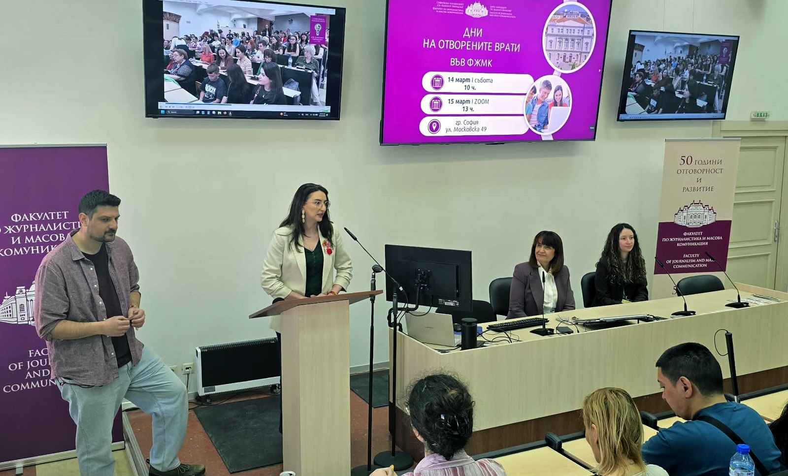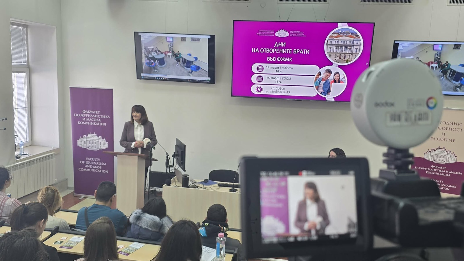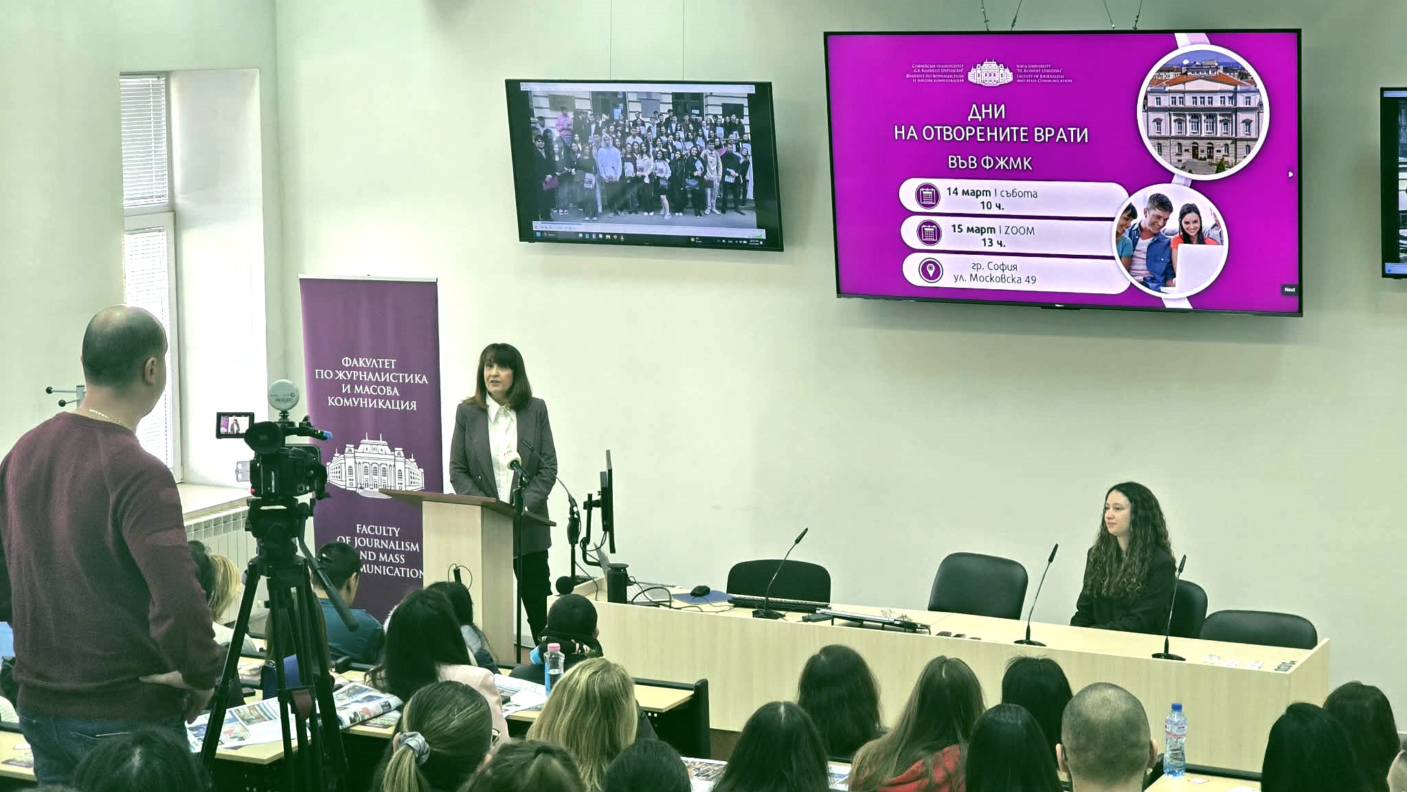 At the end of her address, Prof. Valkanova also presented the opportunities the faculty offers across the three educational levels; prospective students were introduced to the bachelor’s programs, the specific features of the individual fields of study, and the opportunities for training and professional development. Information on admissions, the academic process, practical training, and career opportunities was presented by the Vice Dean of the Faculty of Journalism and Mass Communication, Prof. Dr. Nikolay Mihaylov, Prof. Dr. Svetlozar Kirilov, Prof. Dr. Simeon Vasilev, Assistant Prof. Dr. Victoria Biserova, Assistant Prof. Dr. Irina Garkova, Assistant Prof. Dr. Nikolay Kolev, and Assistant Prof. Lora Turkova. The meeting was also attended by the directors of Radio Alma Mater and Alma Mater TV, as well as other representatives of the academic community.